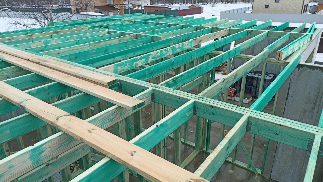 Кровля может быть построена из бруса 150х50мм или SIP панелей. В качестве кровельного материала можно использовать: металлочерепицу, битумную и керамическую черепицу. Также производим кровельные шовные сэндвич-панели.