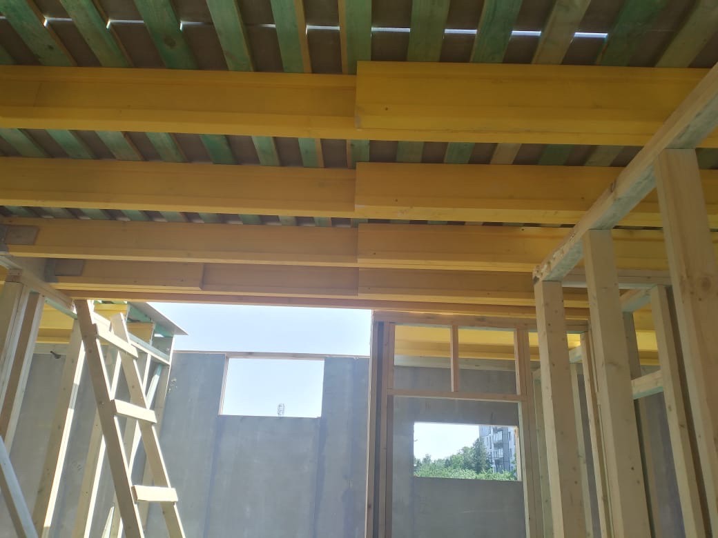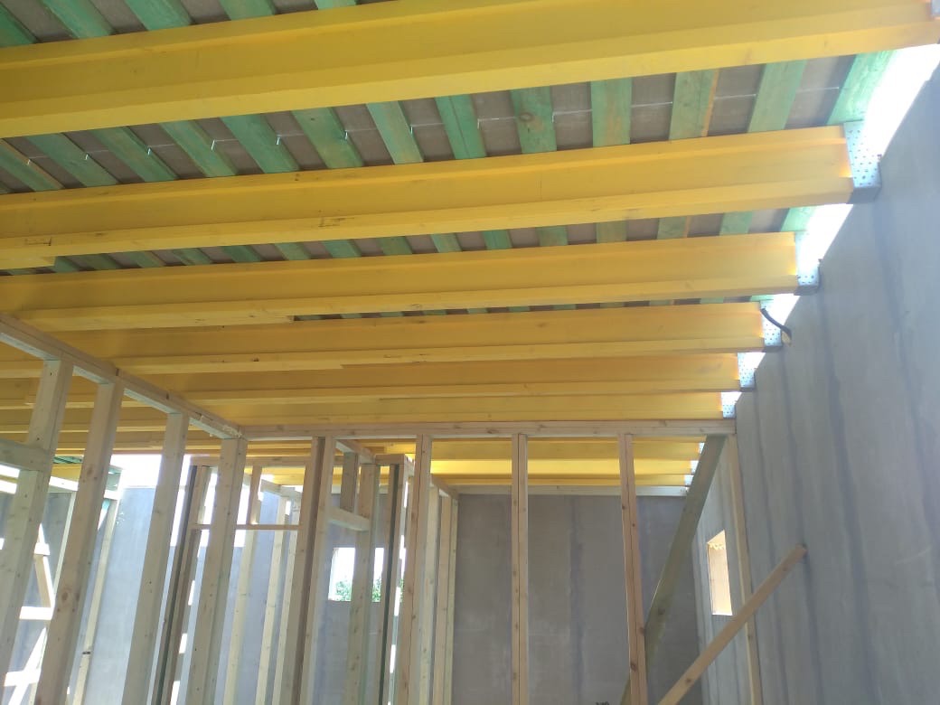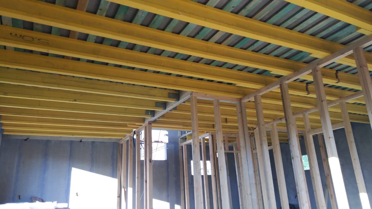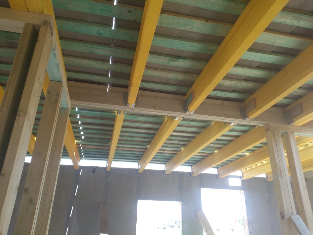 В межэтажных перекрытиях в качестве несущих лаг мы применяем двутавровые балки собственного производства с влагостойкой 24 мм. фанерой в сердечнике.