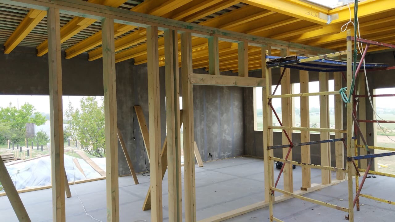 В межэтажных перекрытиях в качестве несущих лаг мы применяем двутавровые балки собственного производства с влагостойкой 24 мм. фанерой в сердечнике.