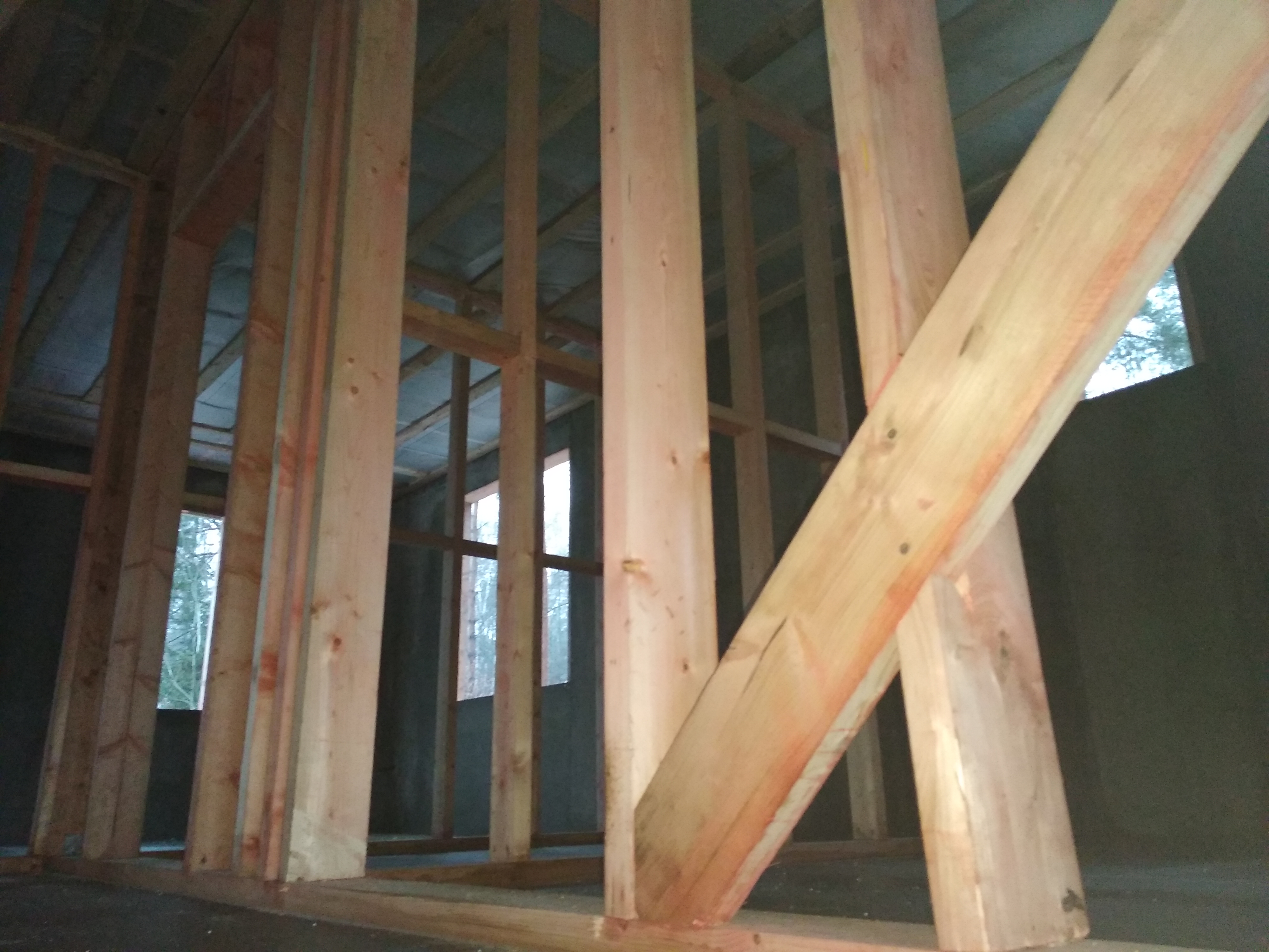 В межэтажных перекрытиях в качестве несущих лаг мы применяем двутавровые балки собственного производства с влагостойкой 24 мм. фанерой в сердечнике.
