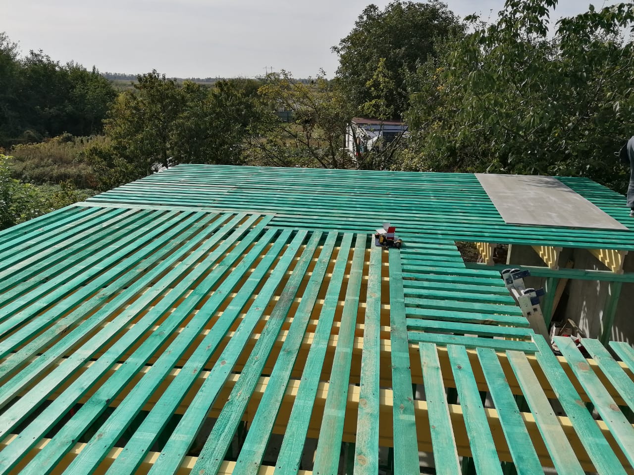 Кровля может быть построена из бруса 150х50мм или SIP панелей. В качестве кровельного материала можно использовать: металлочерепицу, битумную и керамическую черепицу. Также производим кровельные шовные сэндвич-панели.