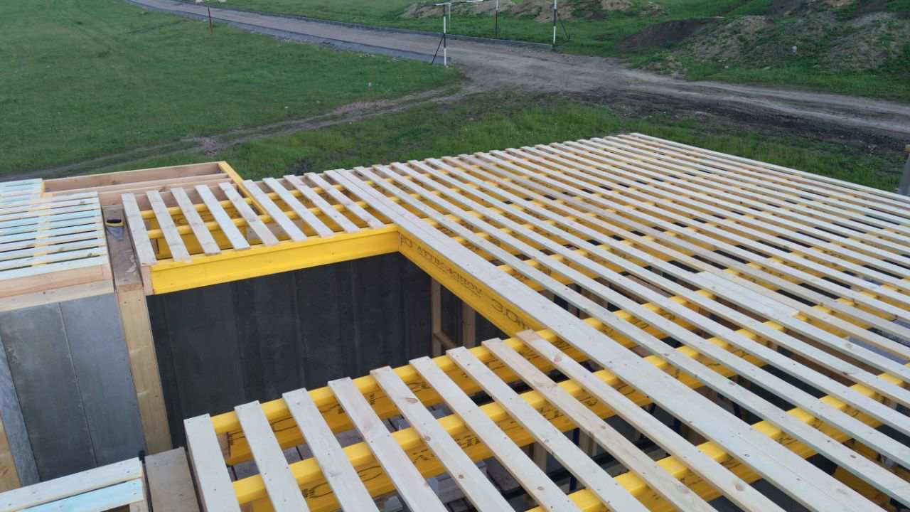 В межэтажных перекрытиях в качестве несущих лаг мы применяем двутавровые балки собственного производства с влагостойкой 24 мм. фанерой в сердечнике.