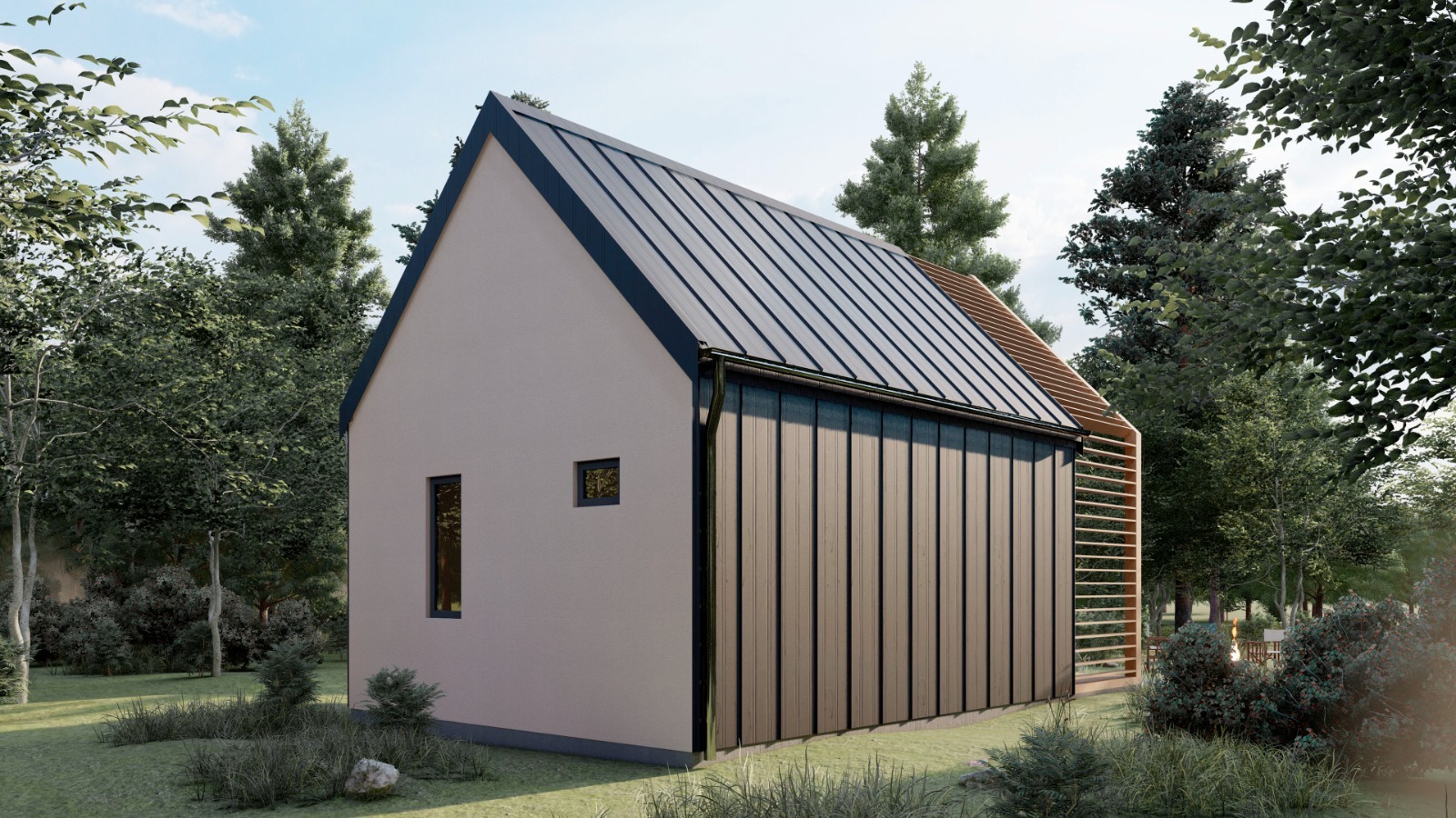 • Плоская или скатная утепленная кровля (пароизоляционная пленка, утеплитель вата на основе стекловолокна или базальта, гидро-ветрозащитная мембрана) с покрытием из металлочерепицы, полимерной мембраны или гибкой черепицы. (цена отличается от выбранного типа) (Ширина карнизного свеса от 30 см. Водосточная система в стоимость не входит
